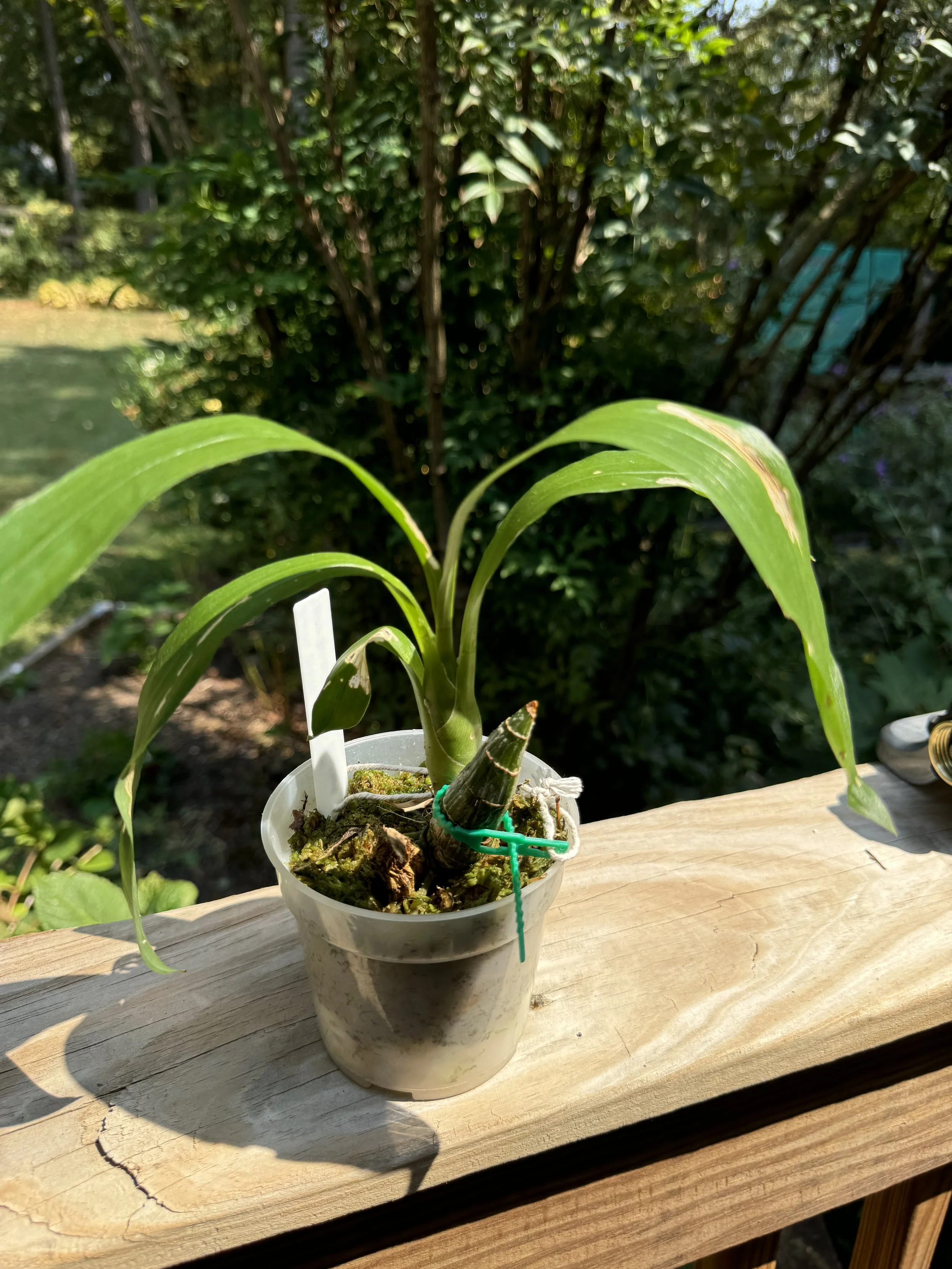 This is the second of two, a division from the first. The original is from White Plains Orchids. Neither has bloomed for me so far. Pictures of flowers are taken from other sources. See better pix on orchidweb.com, which is my very favorite orchid seller on the net. I grow these orchids outdoors in bright light all summer. Next summer I’ll try more fertilizer and some direct sun. I hope they will bloom for me. I love black orchids!