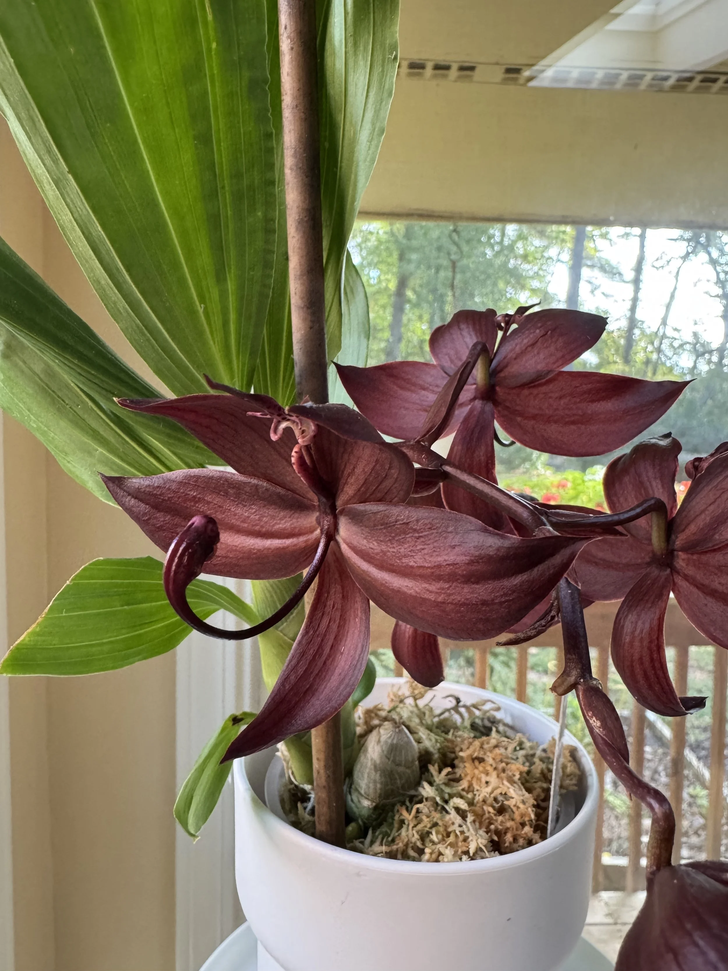 I have managed to kill several of these! The first two came from sunsetvalleyorchids.com, the original and best source on the web for every kind of catasetum you can imagine. They were the highest quality but much smaller. They were perfectly healthy when they arrived so I’m not sure what happened to them. This time I had the good sense to purchase a larger one, in spike, from orchidweb.com (my all around favorite, no-fail, orchid vendor). It bloomed very well, everything I hoped for. I just love the color, plus it has a delicate cocoa fragrance, very rewarding.